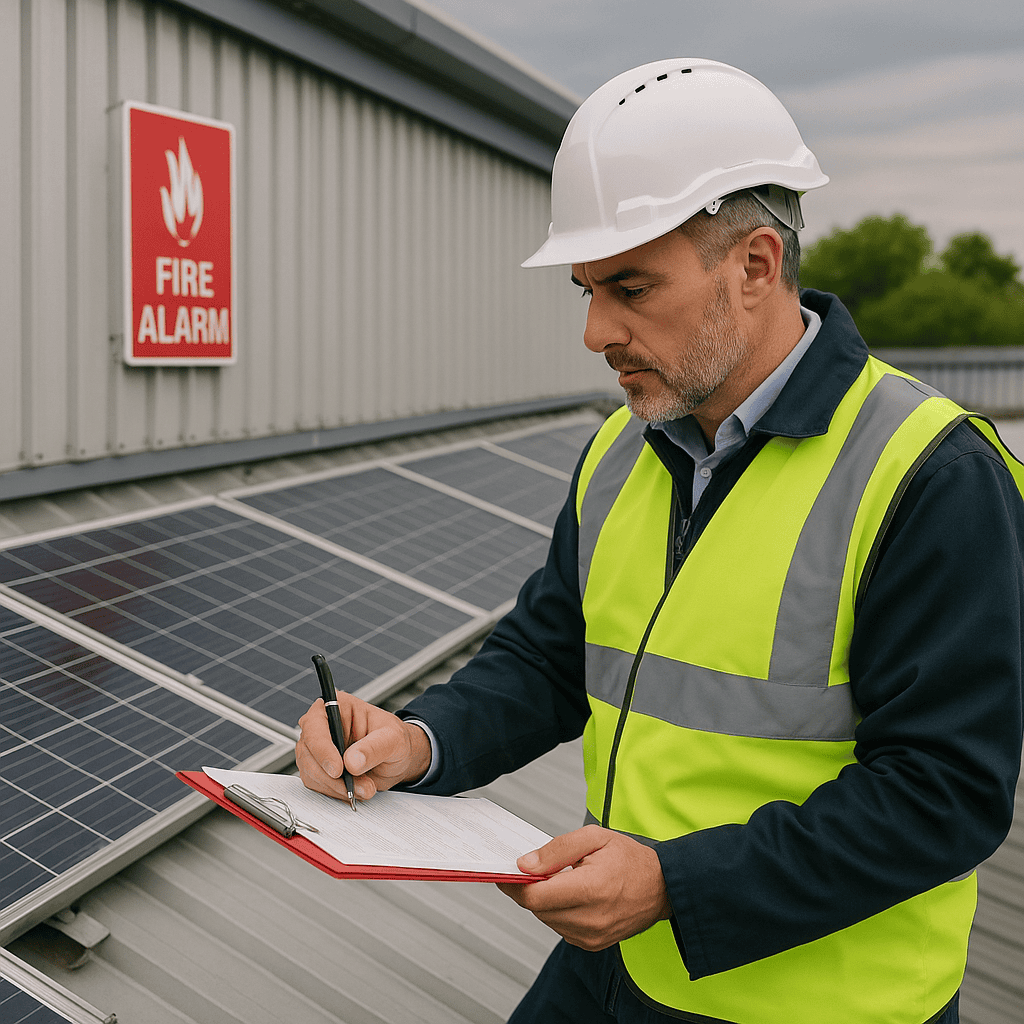 Commercial solar installations must comply with the Regulatory Reform (Fire Safety) Order 2005, ensuring risk assessments are conducted, appropriate fire safety measures are implemented, and systems are regularly maintained to minimise fire hazards and ensure safe operation.