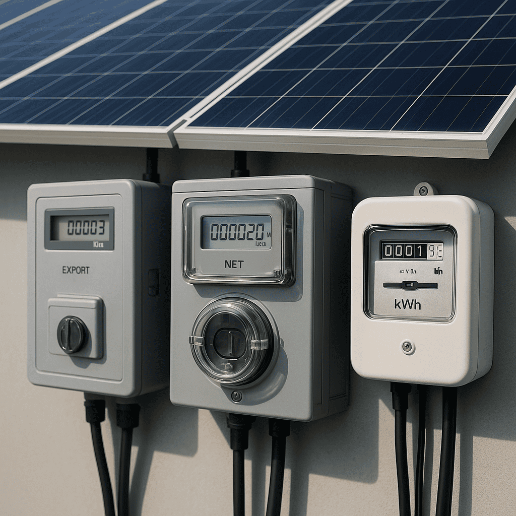 What are the different types of metering and export meters used in solar technology?