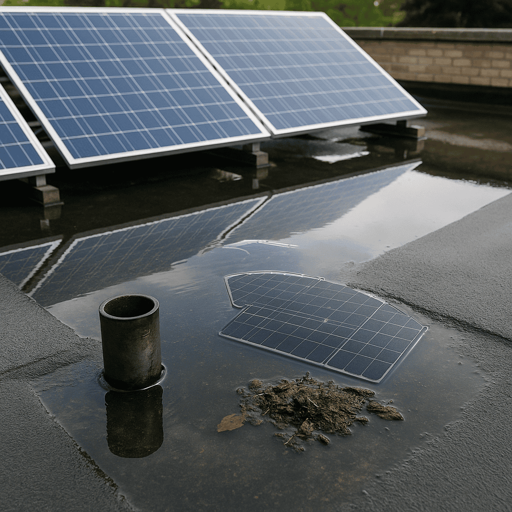 How does drainage and water pooling impact solar panel performance on flat roofs?